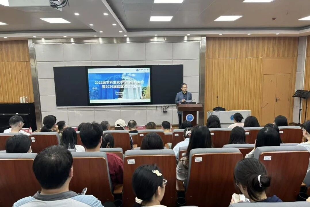 2022级年级大会暨就业动员大会在艺媒楼1114报告厅举行。院长何清俊,党委副书记边建华,视觉与媒体设计系系主任狄丞,环境设计系系主任李待宾,环境设计系系副主任程驰,音乐系系副主任杨青,新闻传播系专业教师、2026届毕业班班主任李静,学工组专职辅导员曾戈晖,兼职辅导员黄灿以及2022级全体学生参加本次大会。此次年级大会由辅导员曾戈晖主持,聚焦2022级本科生关切的最新考研政策、毕业发展规划指导两大核心议题,为同学们搭建起清晰的成长指引平台。
