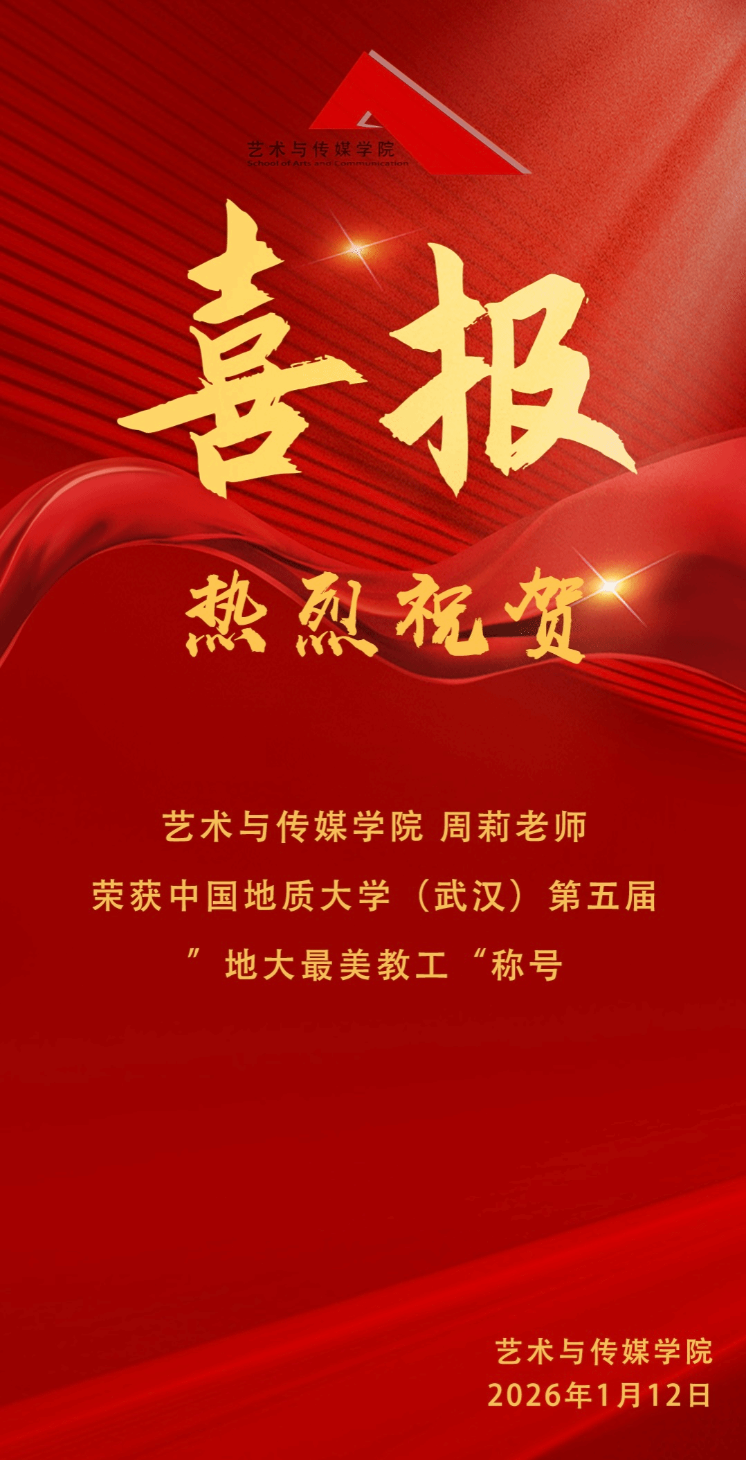 喜报 | 热烈祝贺色色视频 周莉老师荣获中国地质大学(武汉)第五届“地大最美教工”称号!