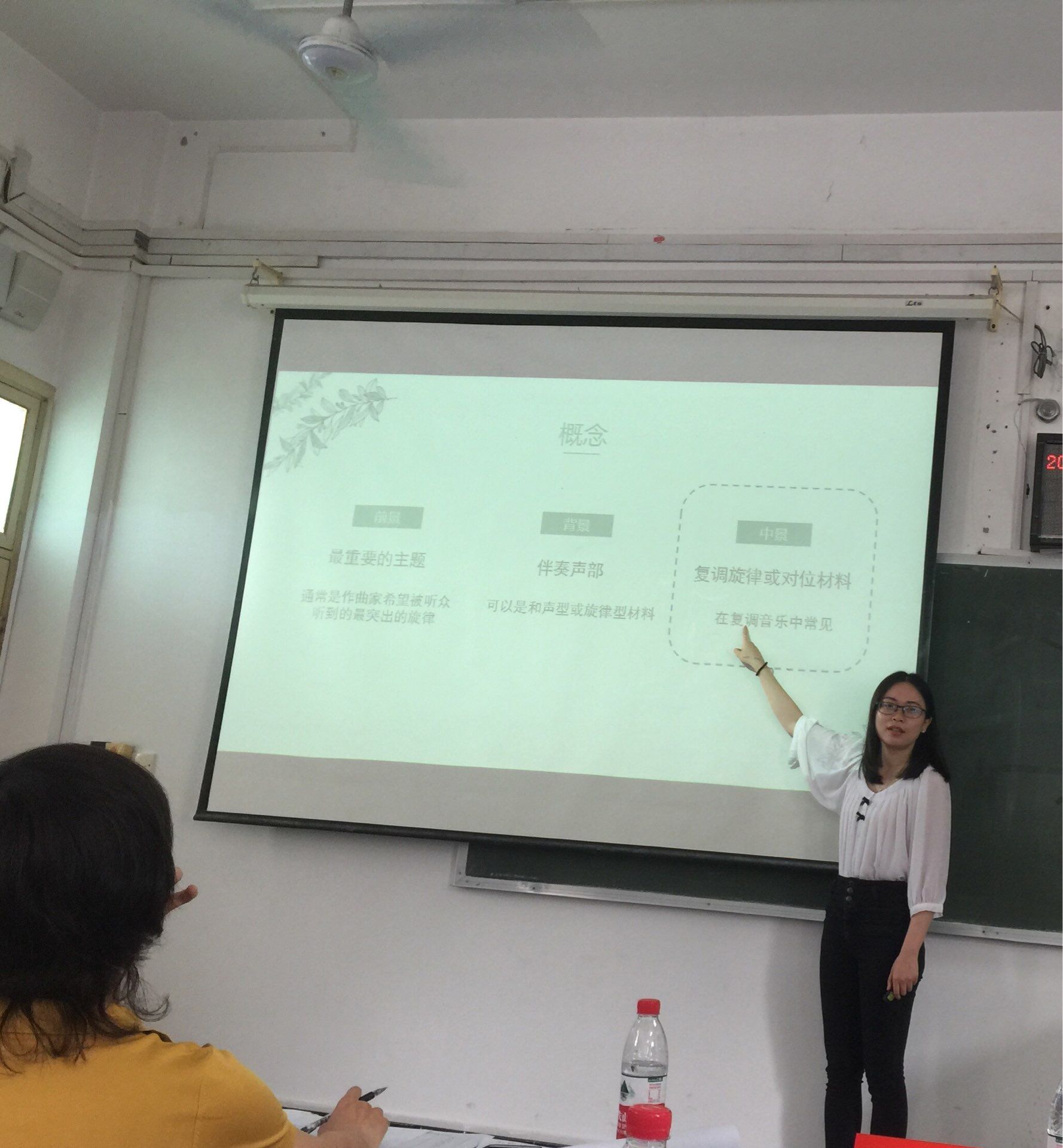 陈柳娇老师选择的讲课内容为《音乐中的前景-中景-背景》,课程导入从画面给人呈现出的视觉层次感获取灵感。讲课伊始,从耳熟能详的小提琴协奏曲《梁祝》入手,通过分析其前景中景的音色处理,及背景的弱化处理,由浅入深,非常形象地阐明配器的思路及重要性。在讲课过程中,在设置的演唱和角色扮演的环节中,与现场老师和同学们积极互动,点燃了现场的气氛。