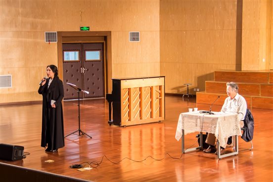 院长桂宇晖教授、邬海峰书记、校团委朱荆萨副书记等领导莅临现场。李光羲先生声情并茂地叙说了他歌唱生涯的特殊时代背景以及发展历程,同时由浅及深,对年轻一代的专业学习寄语良多。在讲座后半部分,李光羲先生对声乐专业的学生进行了具体的指导,指出了歌唱气息的技巧、歌唱情绪的运用等,而后唱响了当年的《祝酒歌》和流行歌曲《让我欢喜让我忧》,亲身示范了从技术到修养的完整呈现,迎得了长时间掌声无数次,其八十八岁高龄的艺术表演状态令人热泪盈眶。