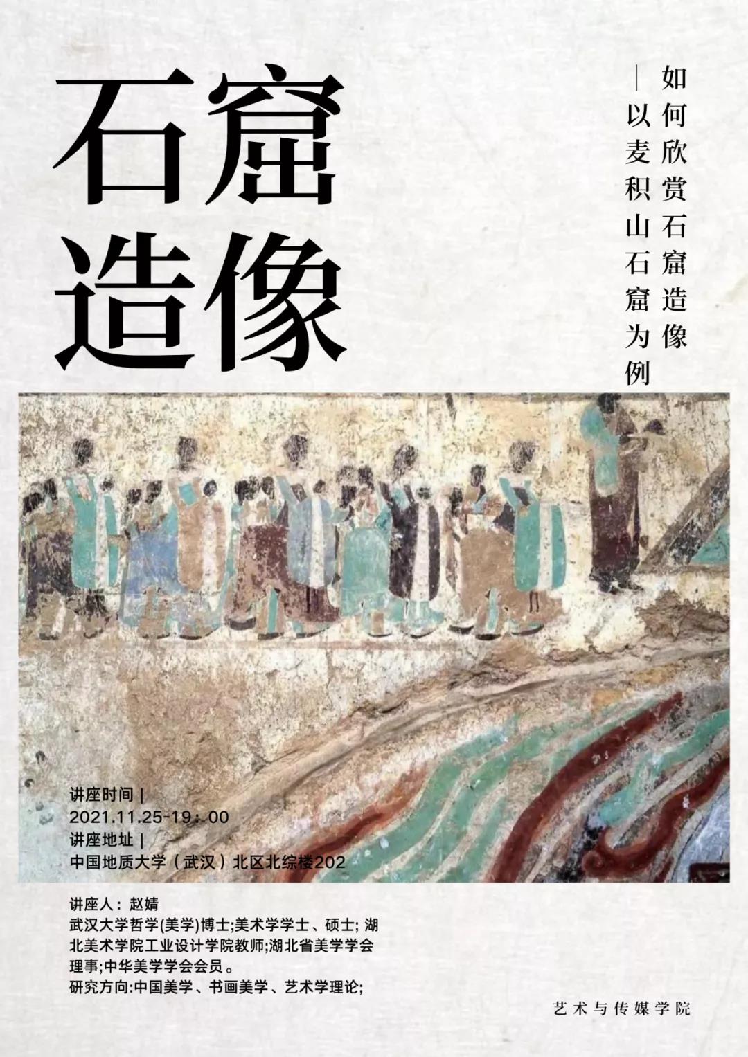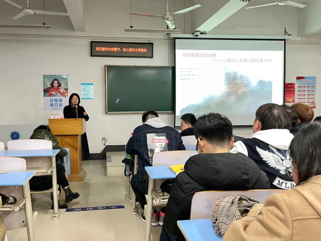 学生传统工艺美术的美学欣赏能力,扩宽学生学术知识维度,中国地质大学(武汉)艺术传媒学院于11月25日19时于东校区综合楼201室举办了“如何欣赏石窟造像——以麦积山石窟为例”主题讲座。讲座邀请了武汉大学哲学(美学)博士、湖北美术学院工业设计学院赵婧老师为大家讲授这堂精彩纷呈的艺术欣赏课。课堂上,赵老师结合自身研究领域,详细为大家讲解了如何欣赏石窟造像,开阔了同学们的眼界,也为同学们补充了石窟雕塑相关的专业知识。讲座通过口述、图片等方式展示,生动具体,吸引了大家的兴趣和关注。
