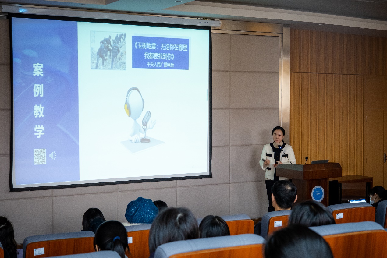 丁洁老师主讲的《广播新闻业务》课程是广播电视学专业主干课,在课程讲授中,丁老师结合十多年新闻一线实践经历,运用线上线下相结合的多元手段,发挥校媒协同实践教学基地优势,着力培养具有牢固马克思主义新闻观的广播新闻复合人才,目前多位学生的音频作品在省级平台播出,多部作品获得省级竞赛奖励,课程教学取得了实效。 在观摩展示中,丁洁老师选取了《广播现场报道》这一教学片段,从概念、原理到方法进行由浅入深、层层相扣的详细讲解,并运用大量中国新闻奖案例对原理进行配套讲解,增强学生对课程理论的理解。课程讲授注重发挥学生主体作用,在难点处设置课堂讨论引发学生思考,在重点处设置案例讲解和课程实践,提升学生的理解程度和实践能力。