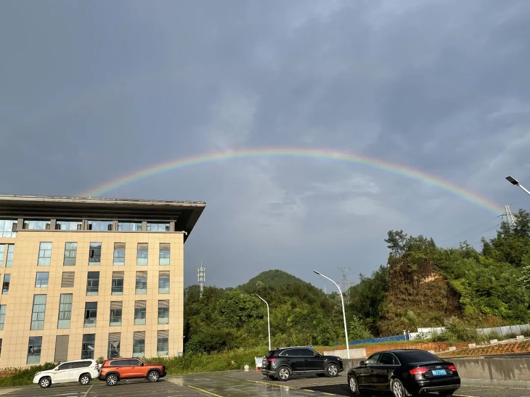 在讲座进行时,窗外大雨倾盆,大家以为这场雨又会下很久。等到结束后,外面下起了太阳雨。耳边传来同学们惊叹的声音,透过淡淡的水雾,转头看到绚烂的七色双彩虹越于教学楼上。同学们纷纷拿起手机,记录下这幸运的时刻。