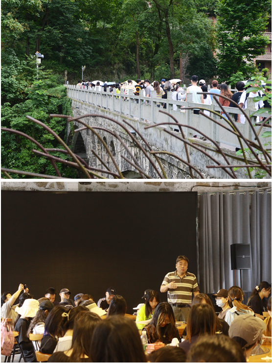 清晨雨后的宜昌是凉爽的,在早晨9点左右,同学老师齐聚在餐厅,由郑立波老师为老师代表叮嘱注意事项以及行程,并邀请了三峡白马营艺术区的两位负责人带领我们参观809度假小镇。