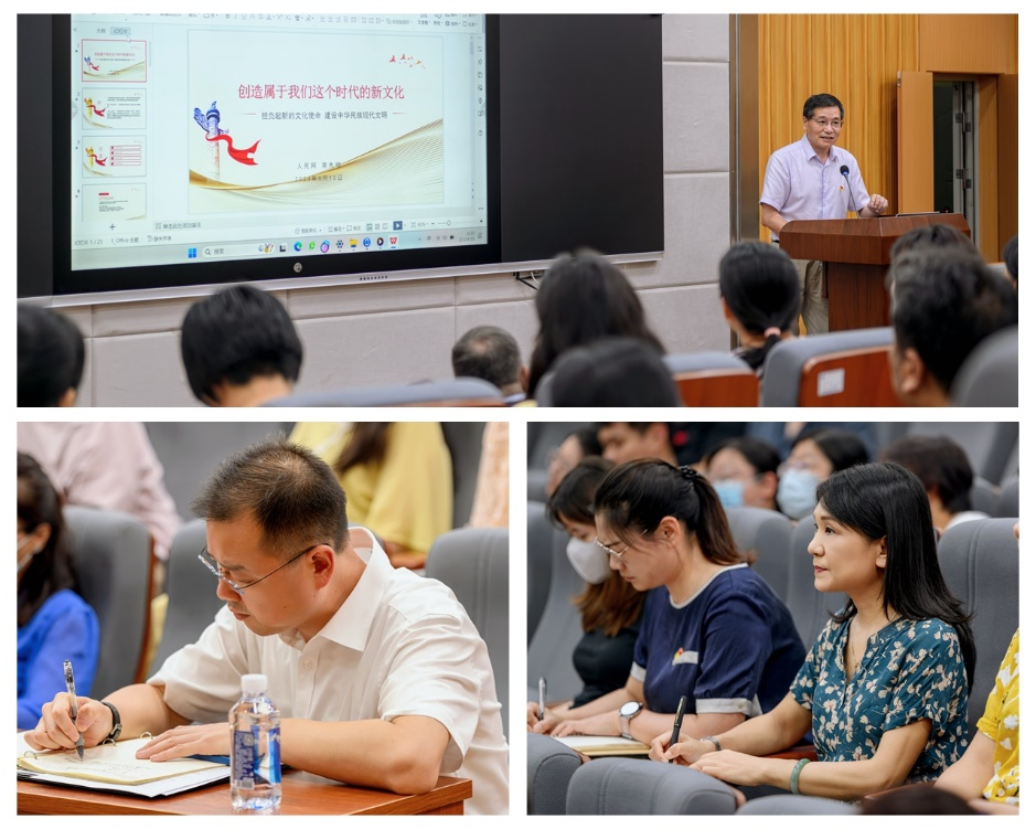 随后荣先明总编从“时代的必然”、“思想的飞跃”、“文化的自觉”、“文明的开新”等四个方面展开论述,深刻阐释了新时代文化工作者应当承担起的新的文化使命和建设中华民族现代文明的历史责任。