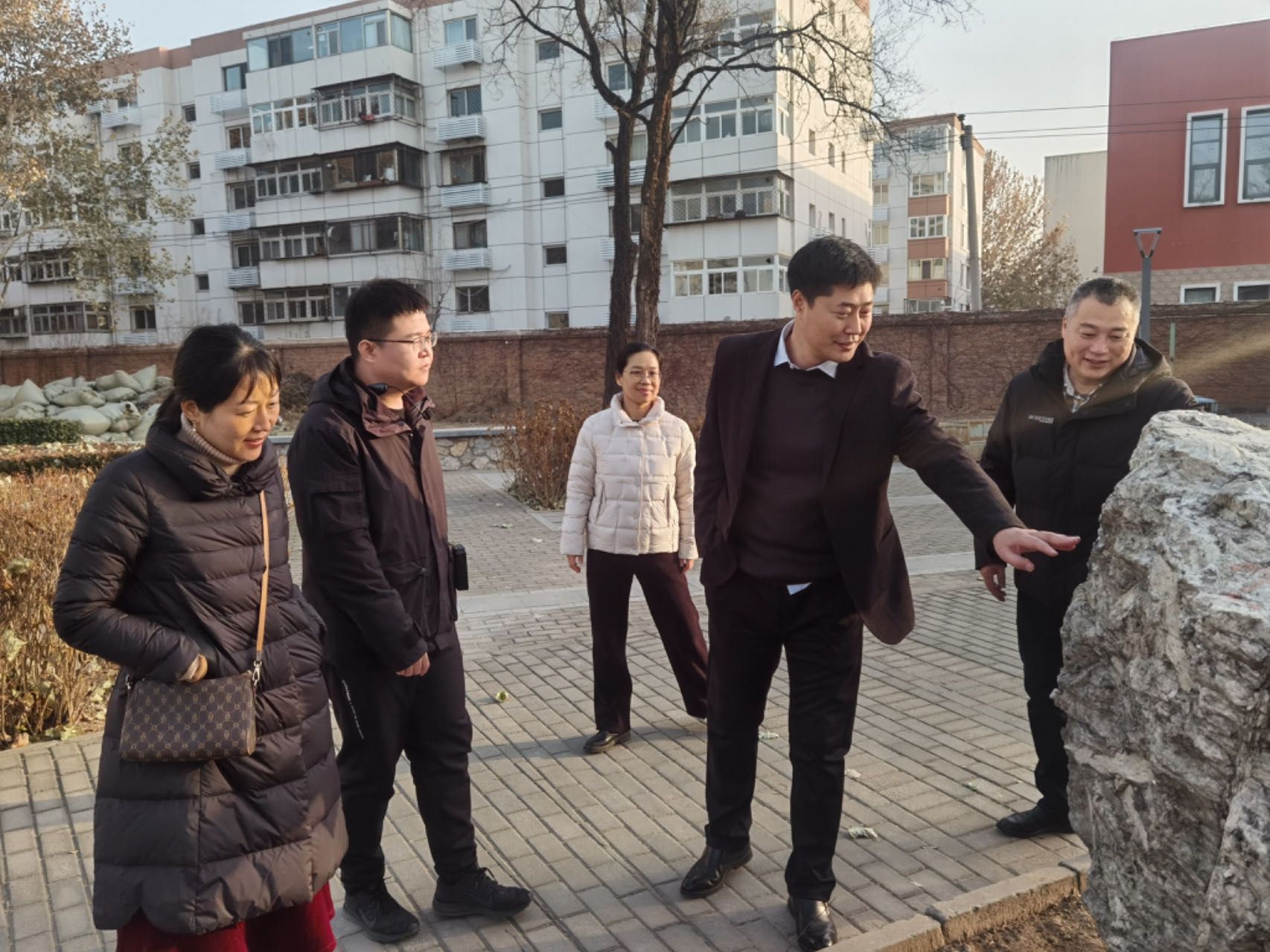 图为参观实物中心标本园时,实物中心副主任张森(右二)向院党委副书记边建华(右一)等介绍标本。