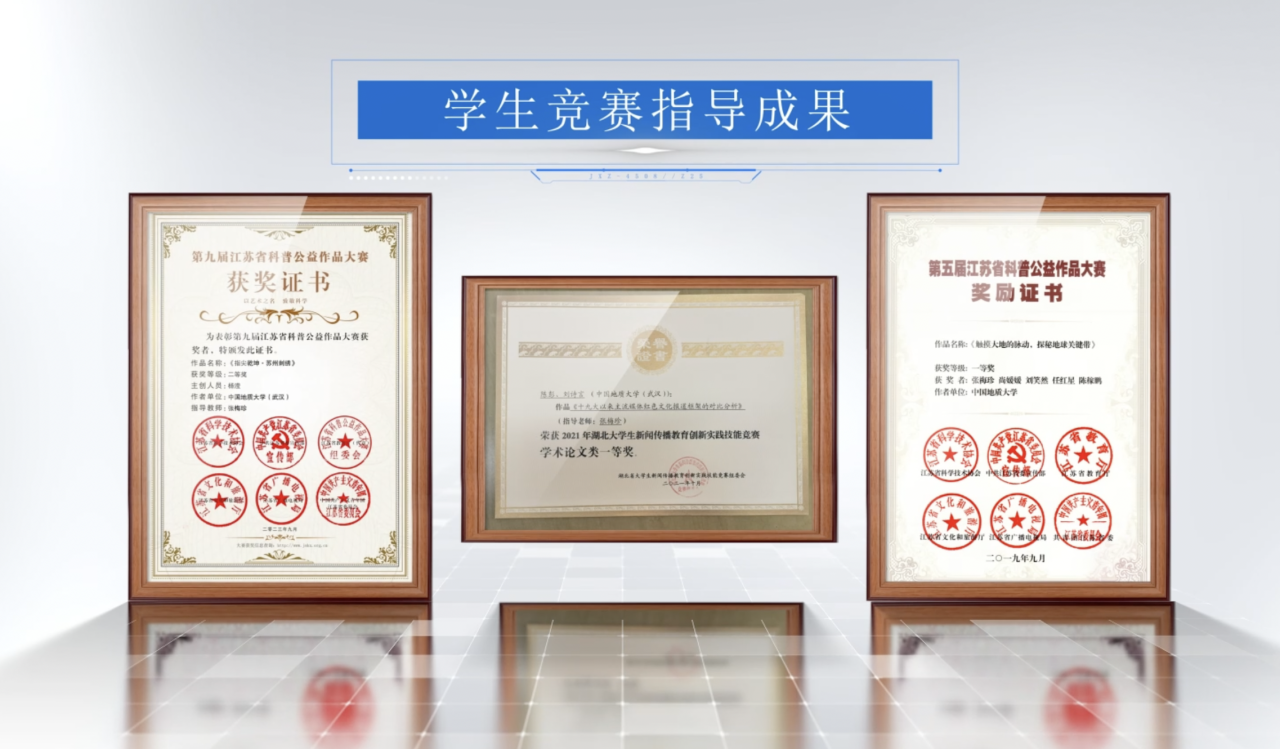 学校的大型活动、建党百年和建校70年系列报道中,总能见到王慧超等学生的名字,他们用文字书写地大红色文化故事;《探秘地球关键带》、《月牙泉的前世今生》等科教片在国家级、省部级各类竞赛中屡获大奖,他们用镜头记录科学的奥妙、地球的神奇;熊雅雯参加湖北省科普讲解大赛荣获一等奖,作为主持人多次主持学校的大型活动。李芷怡在学校的舞台剧《大地之光》中曾扮演女主角楚芸,他们用声音传递美丽中国、宜居地球的大学方略。