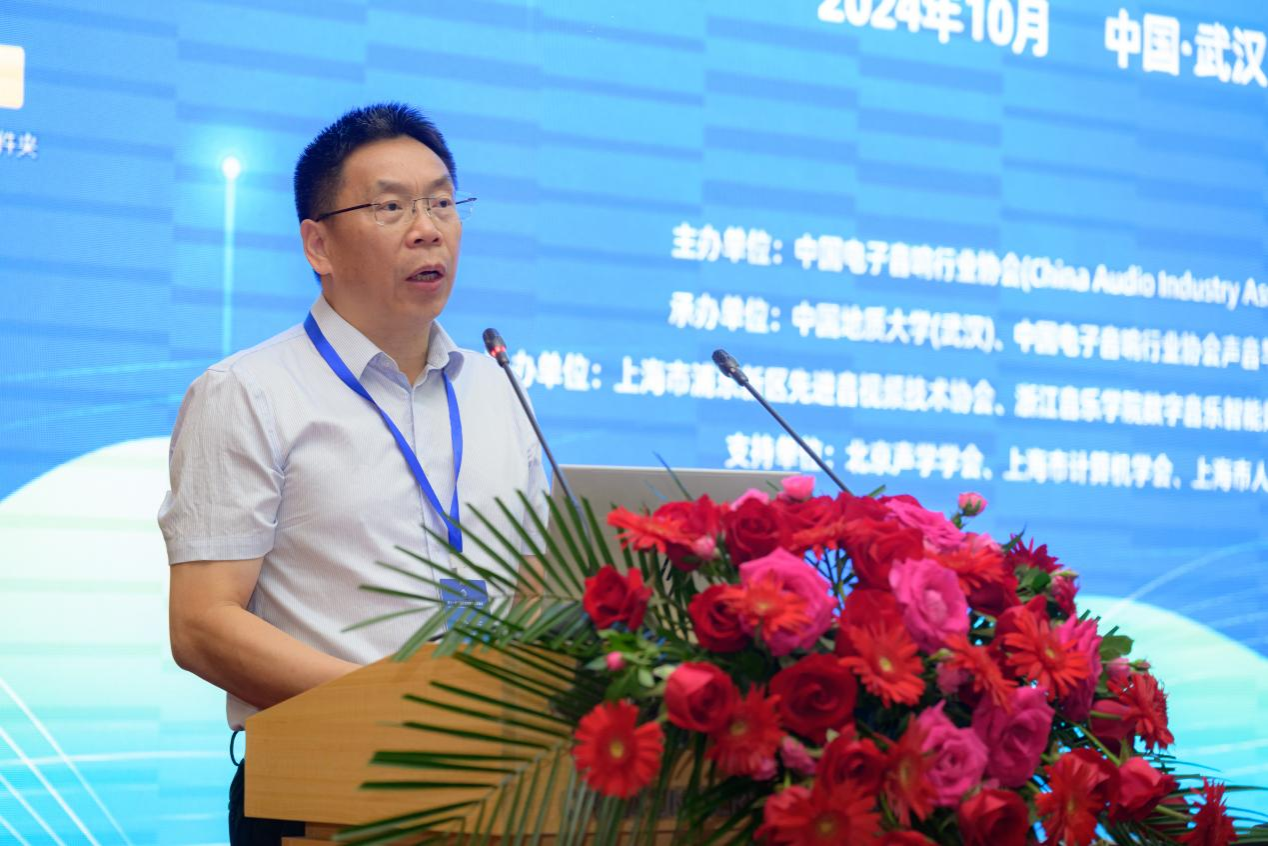 党务副书记王甫在致辞时表示,中国地质大学(武汉)作为本次会议的承办方深感荣幸,他代表中国地质大学(武汉)欢迎大家来到江城武汉。地大长期以来致力于推动声音与音乐技术领域的人才培养和科学研究,本次大会奏响迎宾曲的“海百合音乐机器人”,是学校艺术与科技交互融合的一项重要成果。党的二十届三中全会通过的《决定》中指出,要强化科技教育与人文教育协同。未来的几天里,将有机会聆听到来自国内外专家学者的精彩报告,参与到多个专题论坛的深入讨论。因此,这既是一次学界同仁进行学术交流、开展话题探讨的大会,也是一次业界同行碰撞思想、激发灵感的机会,更是大家共同推动声音与音乐技术创新发展、推进艺术与科技交叉融合的盛会。