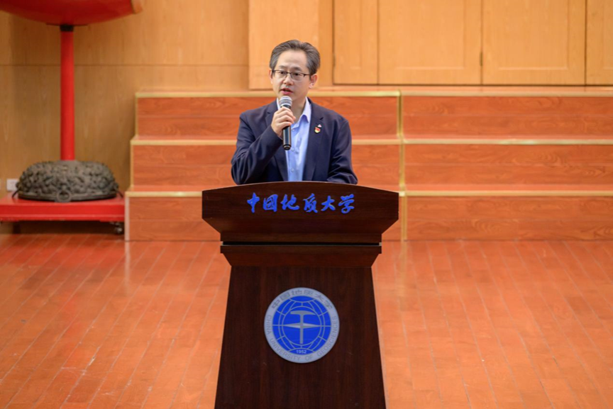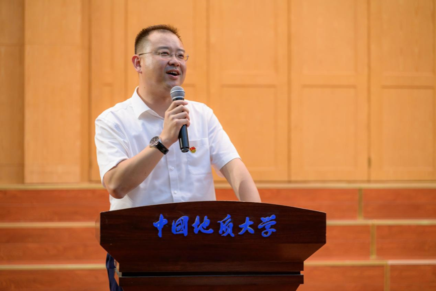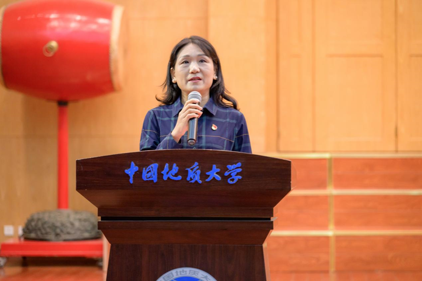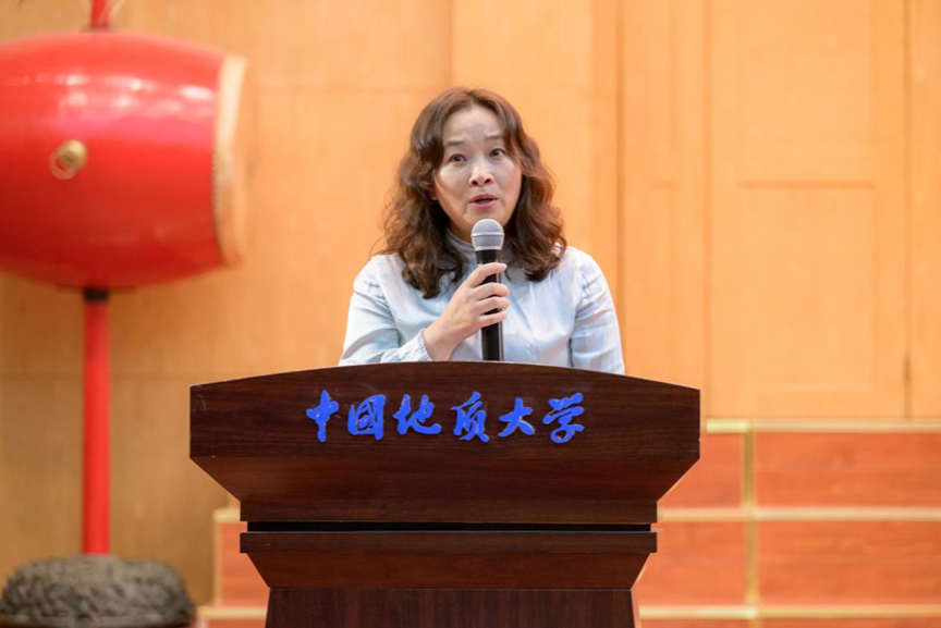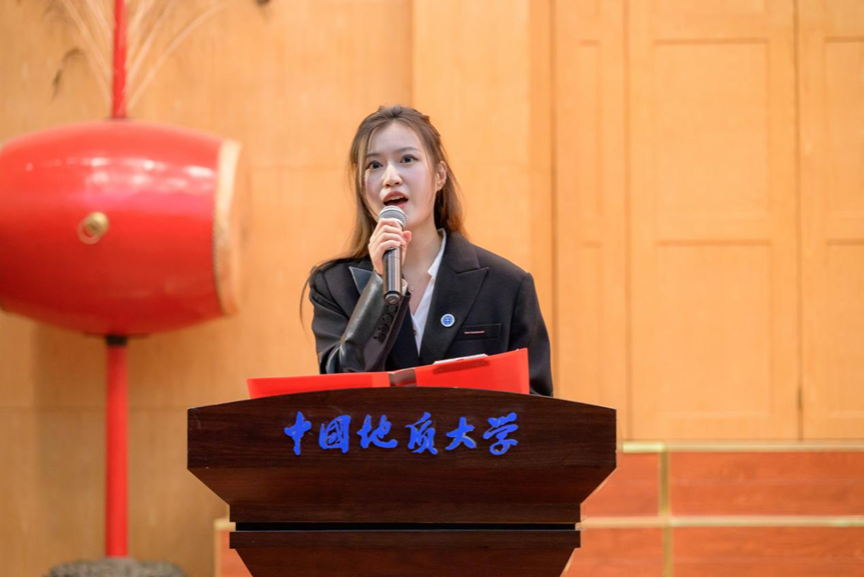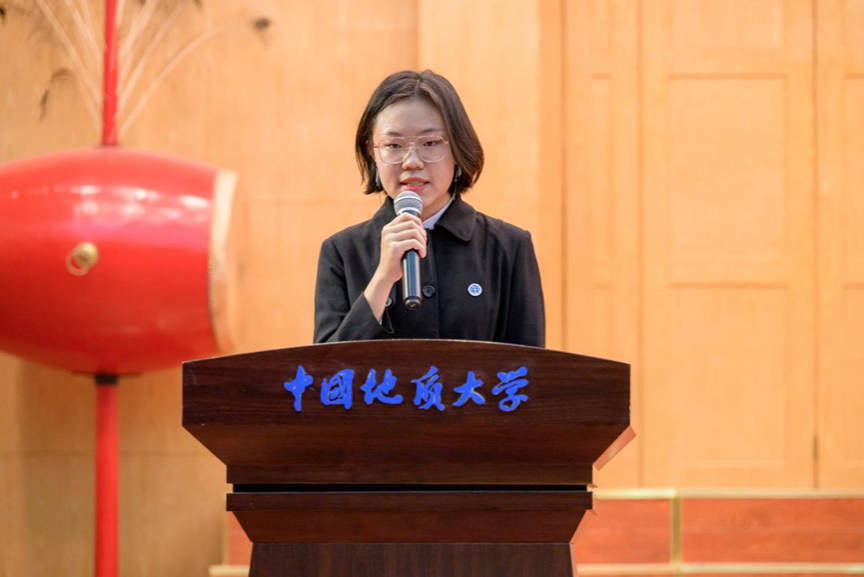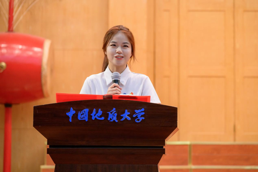 第四项,在校生代表、院学生会主席金煦婷发言。在发言中,她对在地大遇到的言传身教、解答困惑的老师表达感谢,她说道,青春是用来奋斗的,不是用来挥霍的,作为地大人,要贯彻校训精神,努力奋斗。