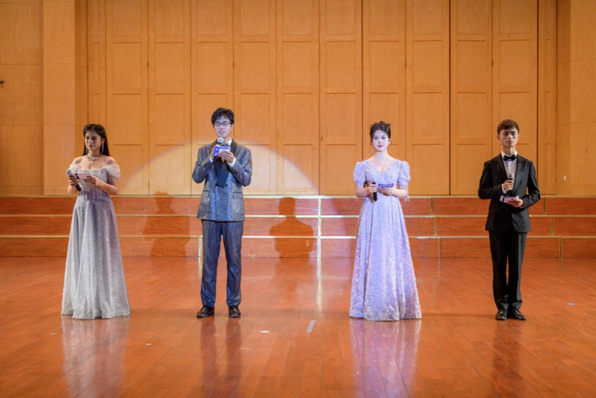 开学典礼结束后,万众瞩目的迎新晚会正式开始。晚会由康裔阳、陈晔、杨淞喆、苏澳四位同学主持。