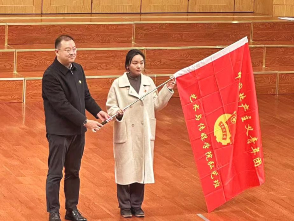 第五项,学院学生会主席金煦婷作为学院代表发表讲话。她提到,作为团学骨干,要凝聚青春力量,共同构筑团学梦想,做到信念坚定、政治过硬、能力突出、作风优良。随后,学院党委书记晋曦为“弘艺班”授旗。