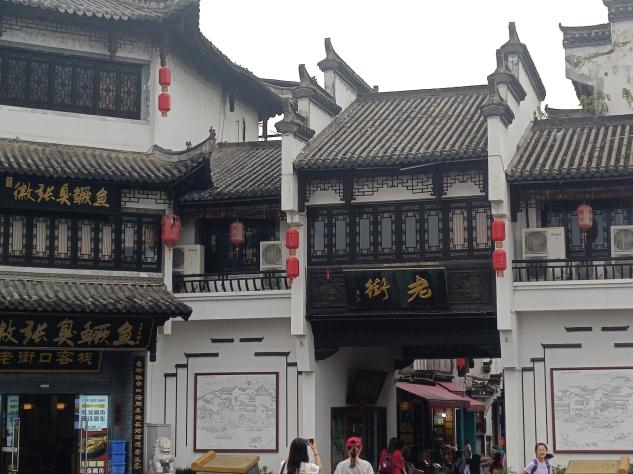 傍晚,大家一起动身前往屯溪老街。屯溪老街包括1条直街、3条横街和18条小巷,由不同年代建成的300余幢徽派建筑构成的整个街巷,呈鱼骨架形分布,西部狭窄、东部较宽。因屯溪老街坐落在横江、率水和新安江三江汇流之处,所以又被称为流动的”清明上河图"。