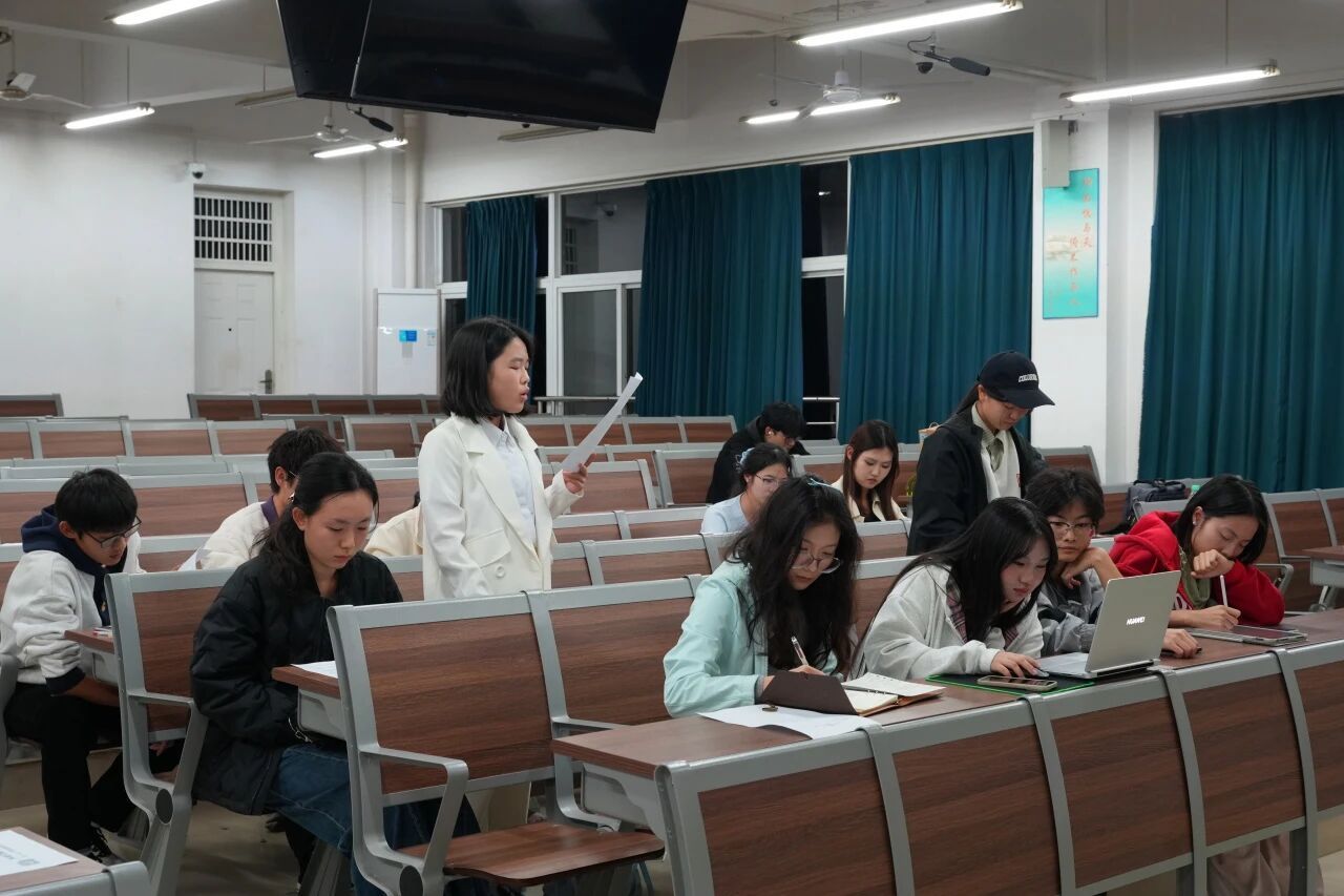 季军赛在北综楼开展,双方分别为由吴佳佳、王珂琰、郑明镜三位同学组成的正方“发财队”与由焦代怡、刘奕杉、赵棚、王嘉乐四位同学组成的反方“太乙队”,他们就“人工智能的创作内容应不应该享有知识产权保护”展开辩论。