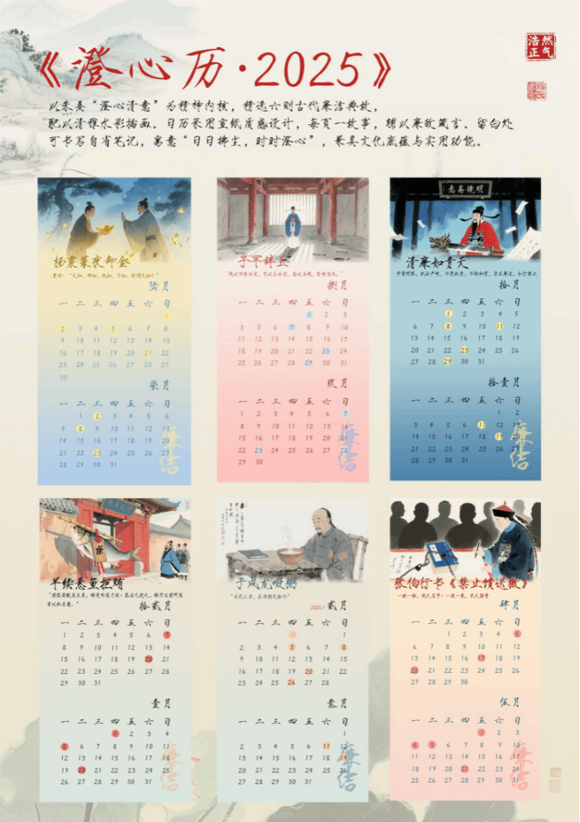 作品简介:作品以朱熹“澄心清意”为精神内核,精选六则古代廉洁典故,配以清雅水彩插画。日历采用宣纸质感设计,每页一故事,辅以廉政箴言。留白处可书写自省笔记,寓意“日日拂尘,时时澄心”,兼具文化底蕴与实用功能。