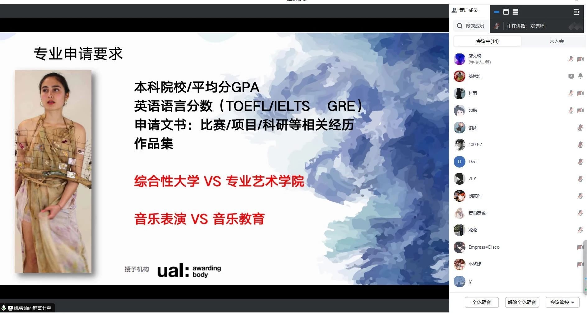 其次,姚老师针对专业申请要求进行了细致讲解。姚老师从在校绩点、英语语言标准、申请文书等方面为同学们讲解留学要求。之后对比了综合性大学、专业艺术学院;音乐表演和音乐教育。分别介绍了几者间的异同性,为同学们提供了更多的留学专业选择。