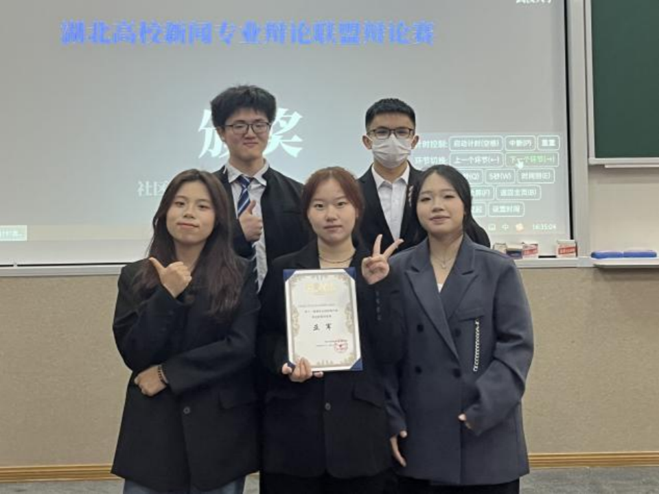 辩论队在本届“新辩盟”比赛中,共有2022级本科生辩手曹家维、朱金川,2023级本科生辩手汪桂珍、廖紫霜、崔雅莉五位辩手上场,先后战胜来自华中师范大学、中南财经政法大学的辩论队,进入决赛。最终以5比7惜败对手,获得本届“新辩盟”辩论赛亚军。