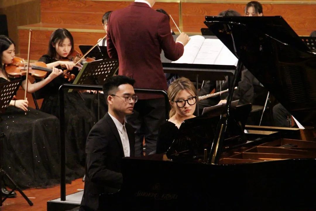 教授、音乐学科带头人、“地大学者”王凯平教授,俄罗斯音乐艺术学科博士、“潇湘爱乐交响乐团”团长、湖南师范大学音乐学院陈果副教授,旅俄青年钢琴家、俄罗斯圣彼得堡国立音乐学院钢琴独奏、室内乐演奏双博士彭斯特老师共同演奏了《三重协奏曲》(贝多芬),三位老师的小提琴、大提琴、钢琴三件乐器的组合与交响乐队相得益彰,室内乐纤细温暖的重奏形式与大型的具有磅礴气势的交响性协奏曲形式巧妙结合在一起, 从而产生出一种生机盎然的新形式,令观众沉浸于美妙的交响乐世界里无法自拔。