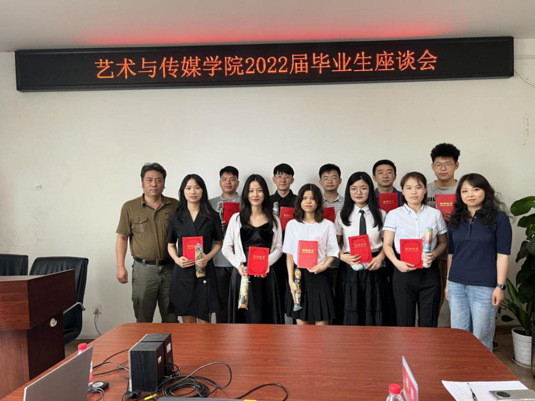 在1209会议室召开2022届毕业生座谈会,学院副院长张梅珍、杨喆、彭静,院党委副书记边建华,视觉与媒体设计系系主任狄丞,景观学系系主任廖启鹏,新闻传播系教师吴颢,学工组全体辅导员以及毕业生代表参加本次座谈会,会议由学院党委副书记边建华主持。