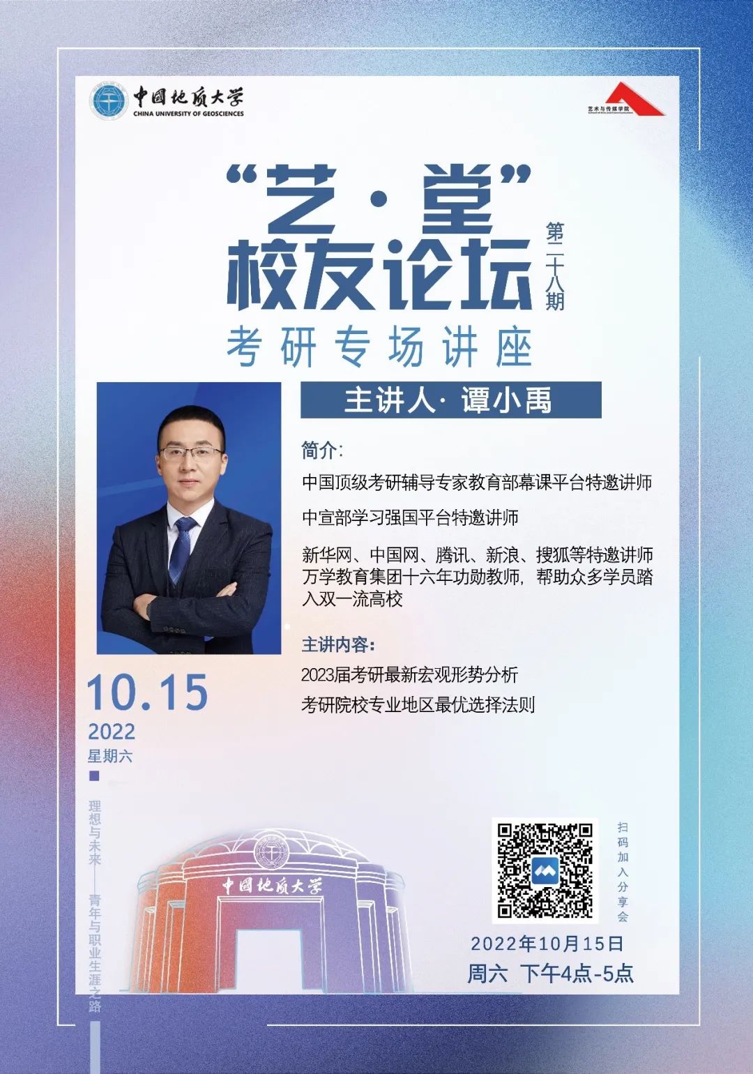 于线上召开了第二十八期“艺·堂”校友论坛考研专场讲座。中国顶级考研辅导专家谭小禹老师做了主题为“2023届考研志愿选报指导”的讲座分享。