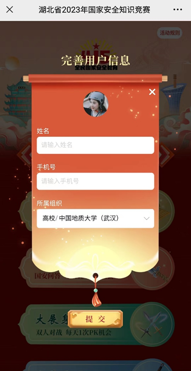 微信搜索关注“楚安君”公众号,点击“知识竞赛”进入大赛平台。注册时,所属组织请选择“高校/中国地质大学(武汉)”。