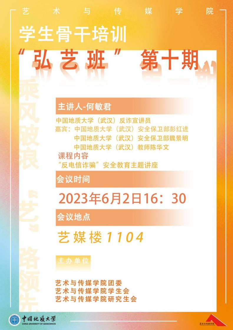 第十期“弘艺班”学生骨干培训在1104报告厅举行,学院研究生会和学生会的主要学生干部以及各班级学生代表参加了培训,本次安全教育培训的主题为《今天你遇到骗子了吗?——防范网络诈骗主题教育会》,由色色视频