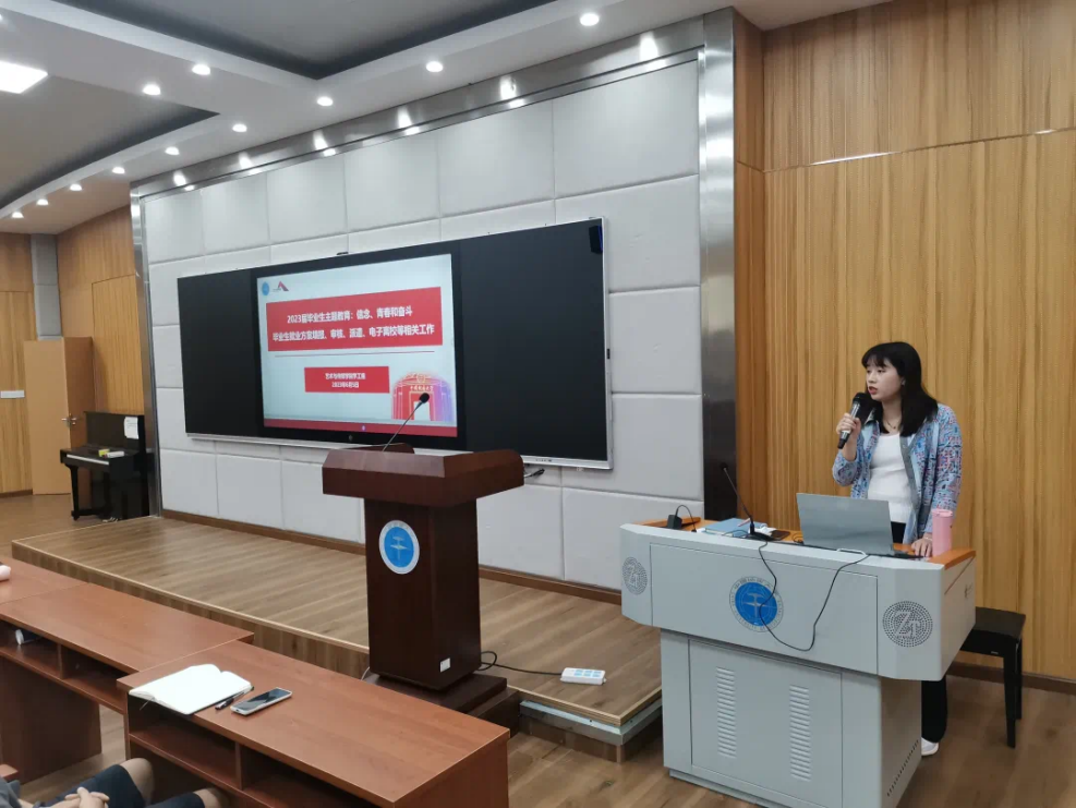 在1104会议室开展以“信念、青春和奋斗”为主题的毕业生教育大会,引导毕业生认真学习习近平新时代中国特色社会主义思想,自觉践行社会主义核心价值观,将个人建功立业的志向与实现中华民族伟大复兴的中国梦相结合,报效祖国、服务人民。
