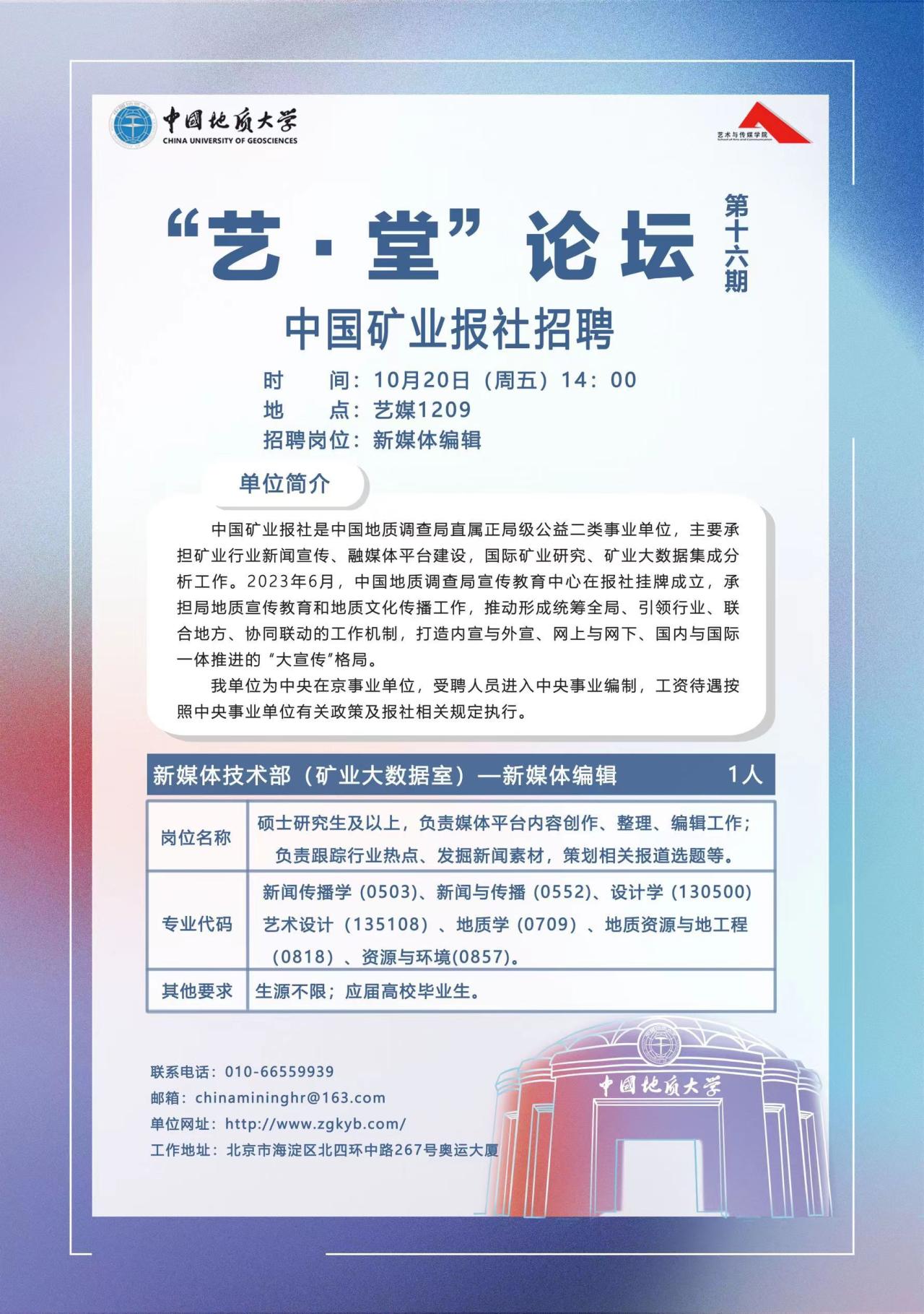 在会议室1209顺利举办了第十六期“艺·堂”论坛。本次论坛的主要内容是中国矿业报社招聘宣讲会,由辅导员单湉艺主持。