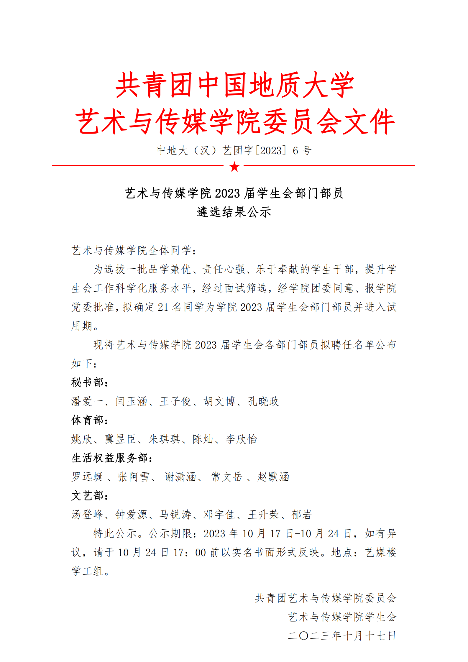 通知 | 色色视频 2023届学生会部门部员遴选结果公示