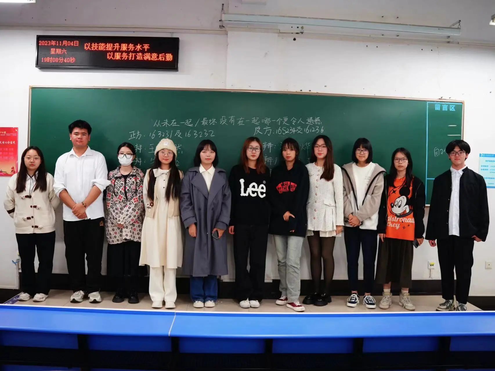 第一场辩论赛在北综楼311举行,由张灿、艾鑫晨露、曹家维担任主评。正方由设计学三班组成,反方由音乐学二班组成。主持人宣布比赛开始后,八位辩手围绕“大学应不应该开设恋爱必修课”展开激烈辩论。反方四辩在质询环节一针见血点出人成长过程中自尊自爱的需求,正方三辩有条不紊的阐述相关观点,赛事异常激烈。最后,评委们就双方存在的问题进行分析指导,提出建议。最终,由音乐学二班代表的反方取得第一场辩论赛的胜利,正方三辩崔雅莉凭借优异的表现获得“最佳辩手”的称号。