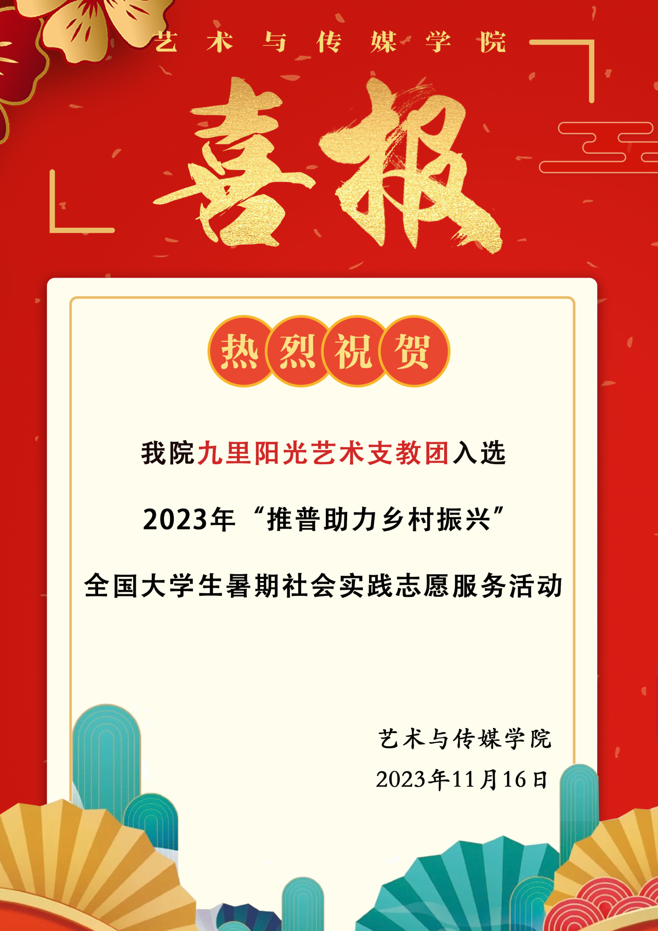 喜报|热烈祝贺色色视频 九里阳光艺术支教团入选2023年“推普助力乡村振兴”全国大学生暑期社会实践志愿服务活动