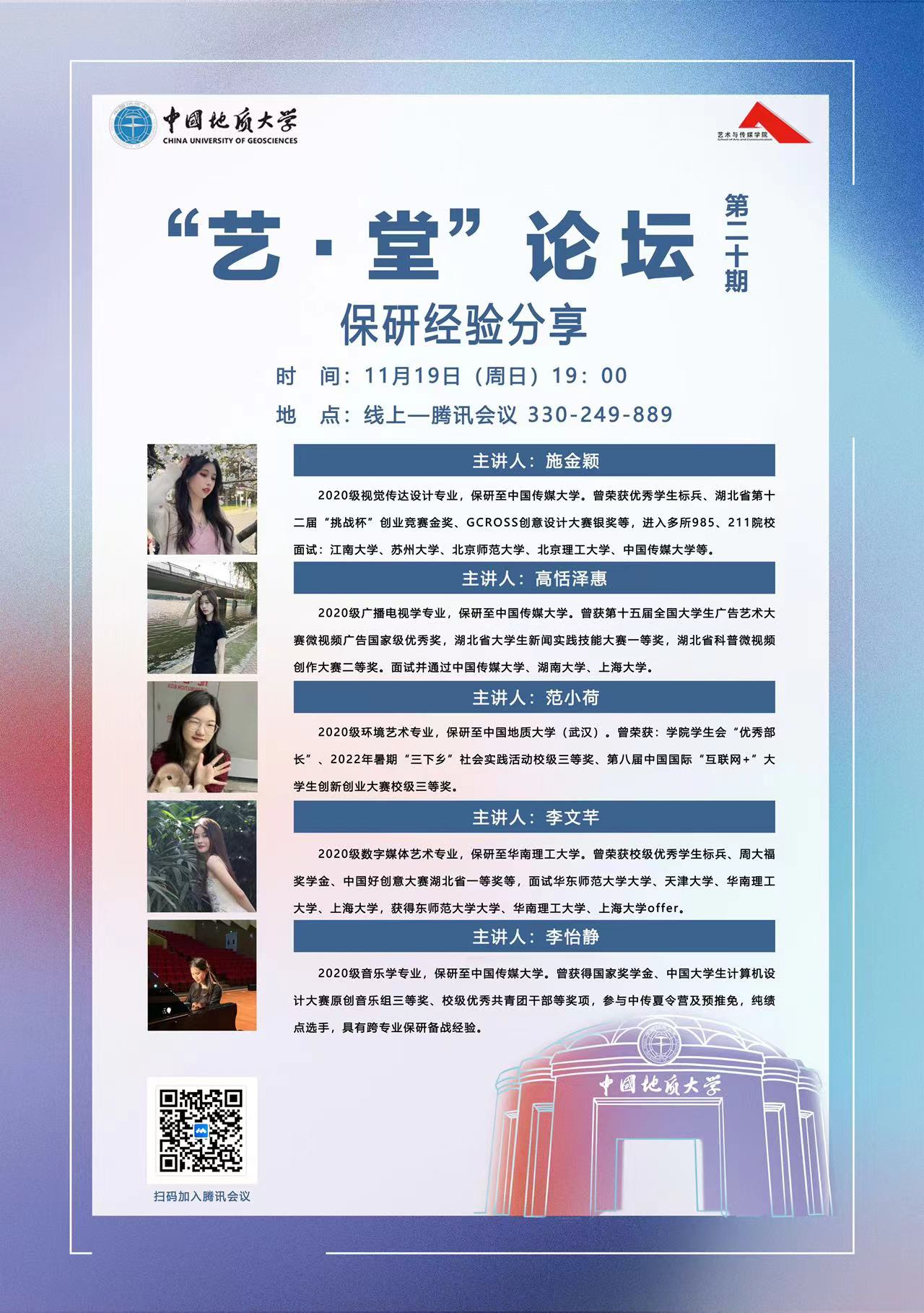 2023年11月19日晚上19:00,“艺·堂”论坛第二十期保研经验分享会于线上腾讯会议平台顺利举行。学院邀请了五位保研上岸的不同专业的同学,分别广播电视学保研到中国传媒大学的高恬泽惠同学、视觉传达设计学保研到中国传媒大学的施金颖同学、数字媒体艺术学保研到华南理工大学的李文芊同学、环境艺术学专业保研到中国地质大学(武汉)的范小荷同学,和音乐学保研到中国传媒大学的李怡静同学进行保研经验分享。本次讲座由兼职辅导员徐雯茜主持。