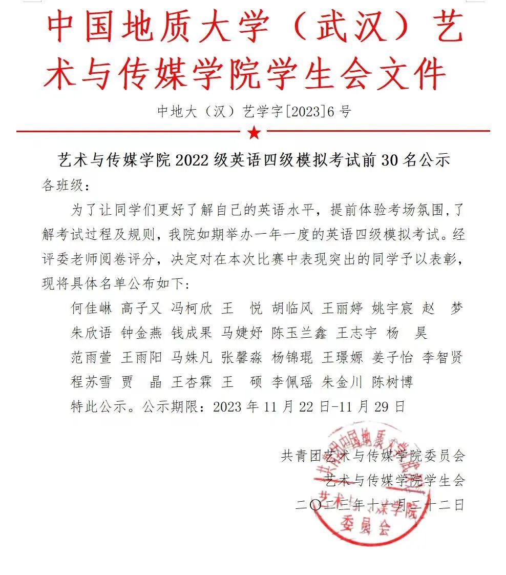 公示 | 色色视频 英语四级模拟考试前三十名公示