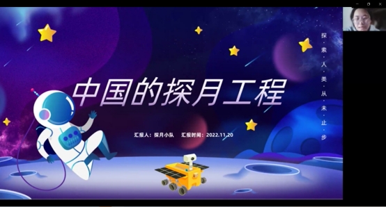 2021年12月5日晚上19点整,党支部以线上会议的形式召开了艺术党课分享活动,钟思怡同志、周娅同志和李子微同志以《中国的探月工程》为主题,以艺术党课的形式向支部党员讲述中国的探月精神,通过“PPT讲述+短视频放映”的方式向支部党员讲述了探月的历史,中国现代的探月工程,以及嫦娥五号等,弘扬了我国的航空航天精神,是一节引人入胜的艺术党课。