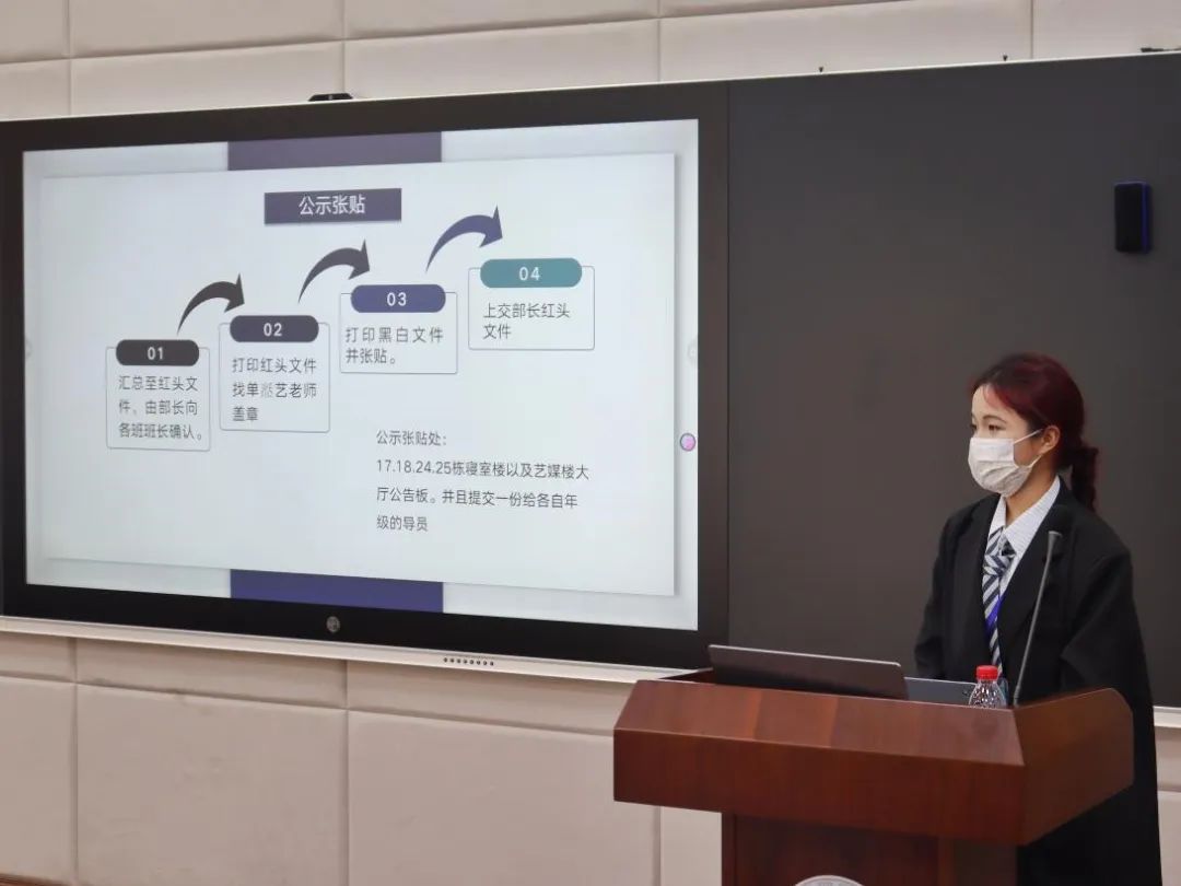 2023年团委及学生会优秀部⻔评优答辩在艺媒楼1104报告厅顺利召开,学院学生会主席团及各部门成员参加了本次答辩。